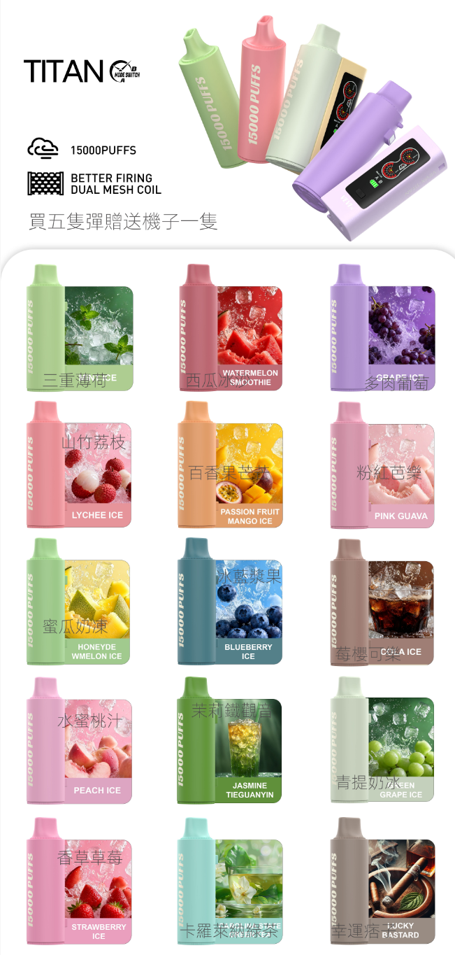 限時活動-(買5顆彈送1隻主機 隨機顏色) VEVIX 泰坦15000口棉芯換彈拋棄式煙彈 泰坦耐抽王