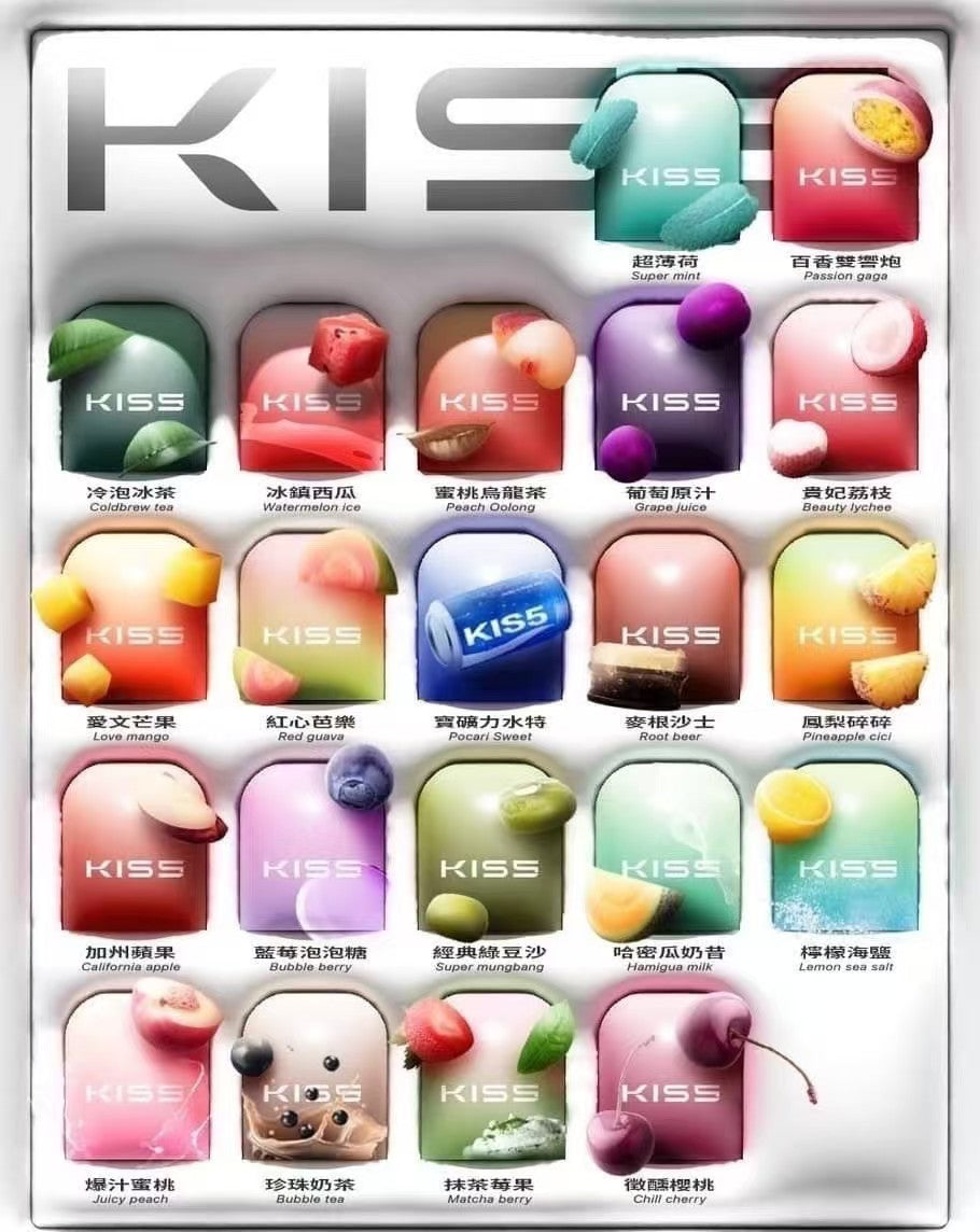 - 多樣口味:KISS煙彈提供多種口味選擇,從經典煙草到沁涼薄荷,再到各種水果口味,讓你隨時隨地都能找到最愛的那一款!